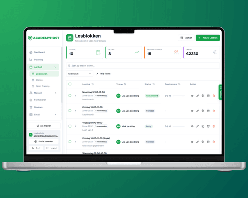 Stel vaste lessen in met dag, tijd, trainer, niveau en locatie.